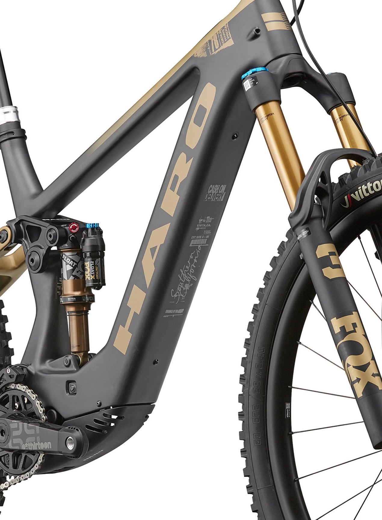 The suspension package is uncompromising: a FOX 36 FLOAT Factory fork with GRIP X damping, Kashima coating, and 150 mm of travel up front, paired with a FOX FLOAT X Factory rear shock for maximum traction and control.