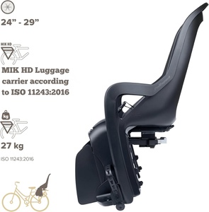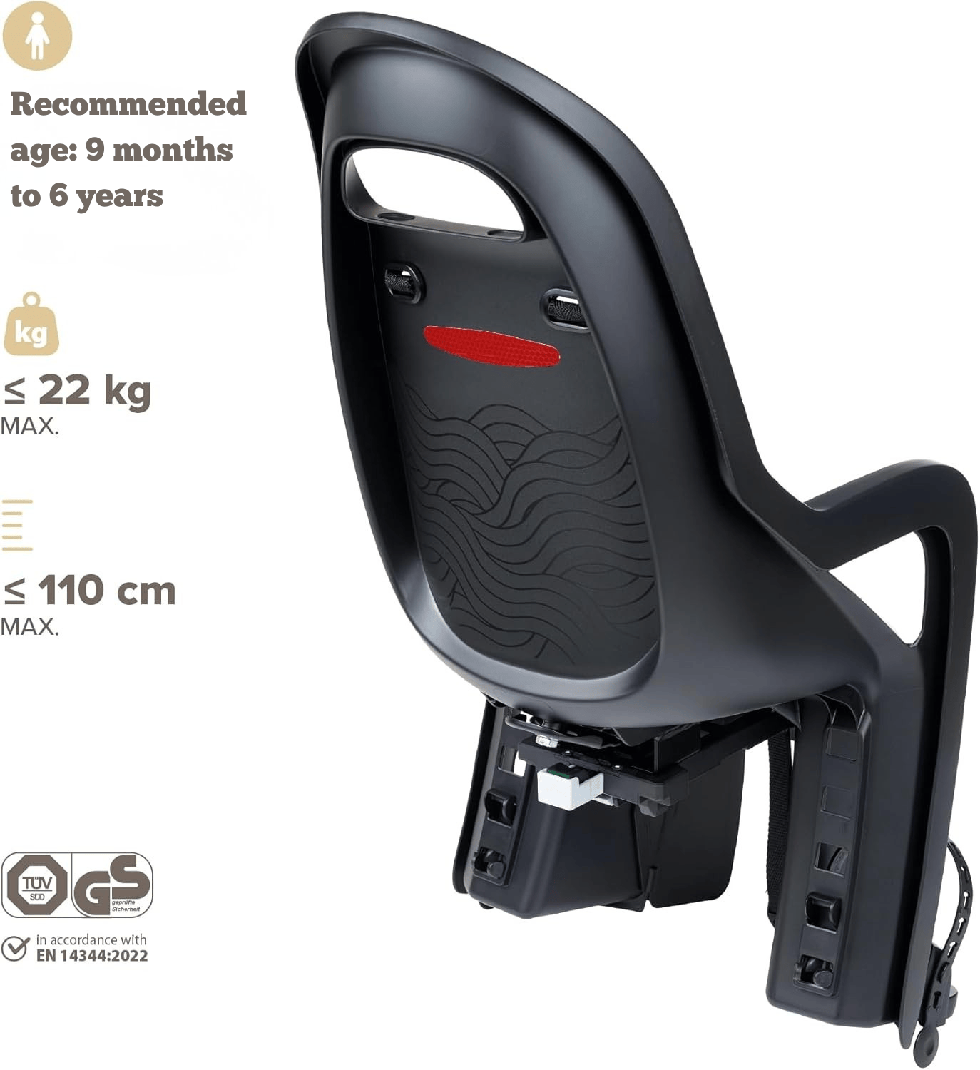 Recommended for children from 9 months to 6 years, up to 22 kg and 110 cm tall. The seat is compatible with e-bikes and pedelecs up to 25 km/h. Lightweight at only 2.65 kg and measuring 400 × 715 × 495 mm, the Groovy MIK-HD rear seat is a practical, safe, and comfortable solution for taking your child along on every ride.