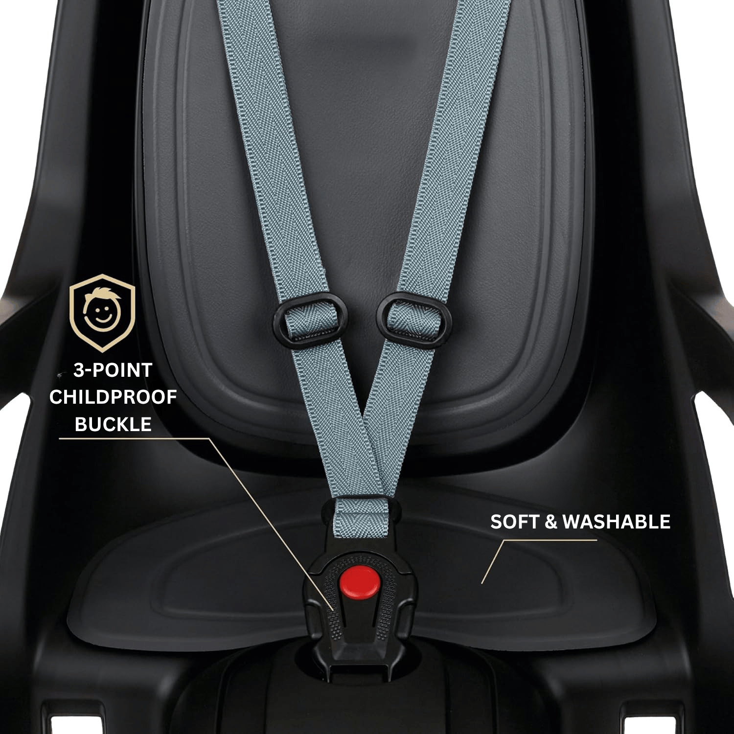 Child safety is guaranteed with a 3-point adjustable harness, childproof buckle, extra frame belt, and reinforced foot protection—all compliant with EN14344:2022 and TÜV approved.