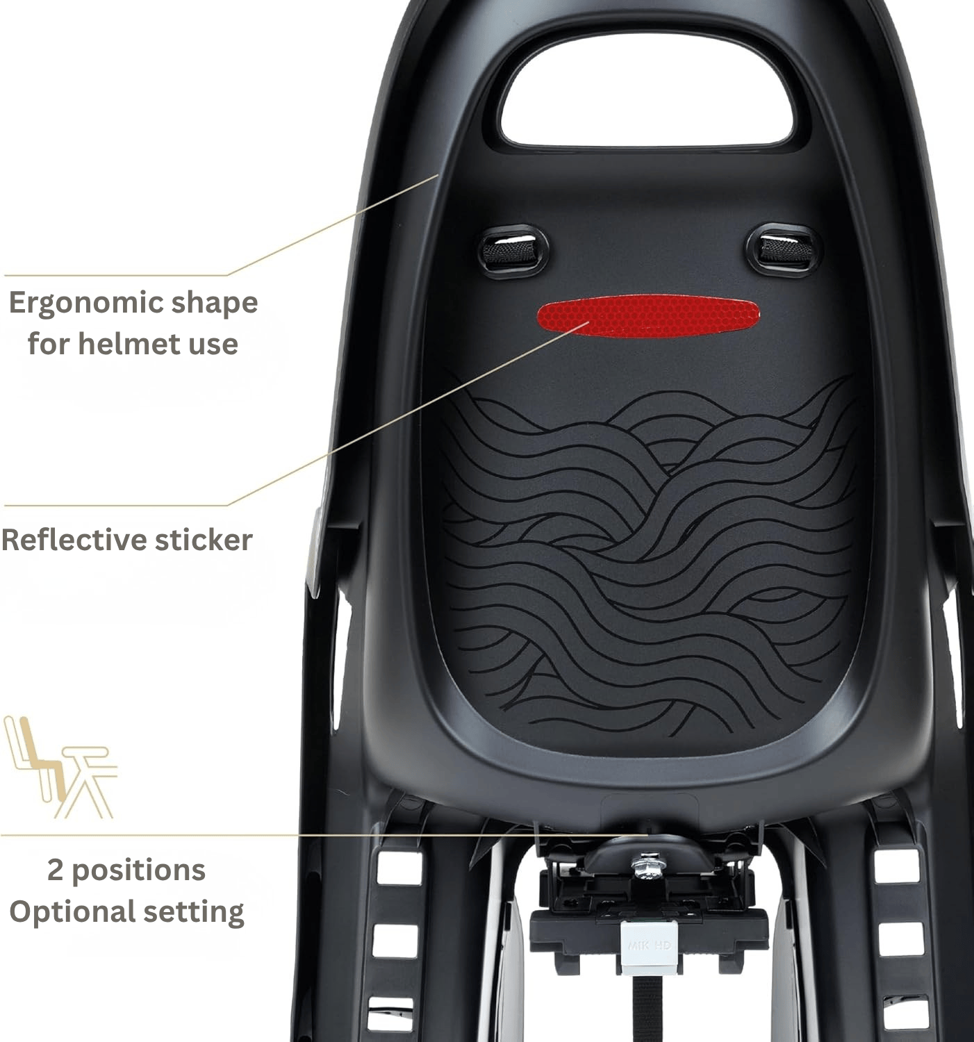 The Polisport Groovy MIK-HD Rear Bicycle Seat is designed to provide maximum safety, comfort, and practicality for everyday rides or family trips. Thanks to the integrated MIK-HD mounting system, the seat attaches firmly and securely to racks engraved with MIK-HD that comply with ISO11243:2016 and support up to 27 kg. Installation requires no tools, and the seat is ready to use straight out of the box.